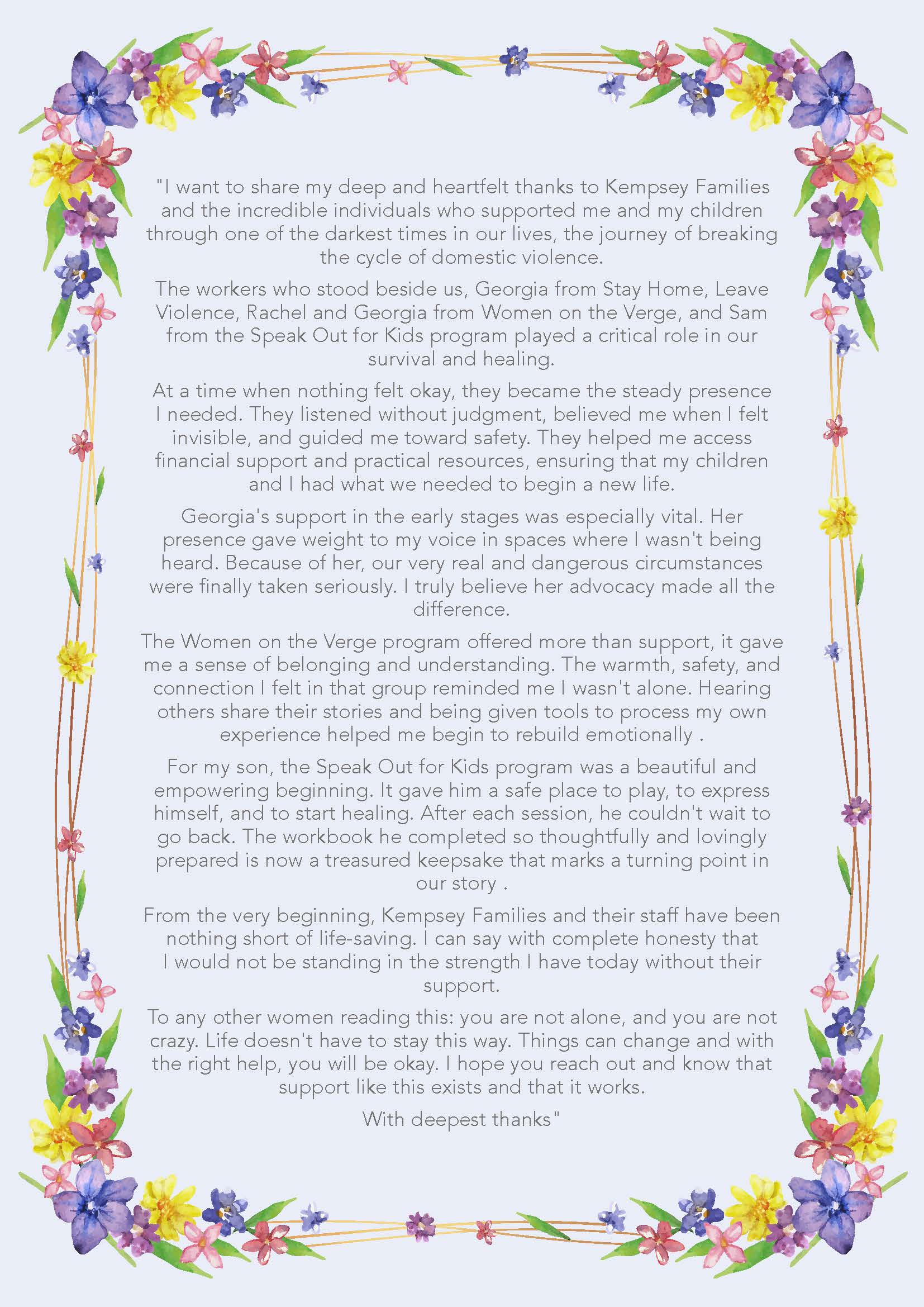 We recently received a very special client testimonial that we would like to share with all our clients, partner agencies and the wider Kempsey Community.